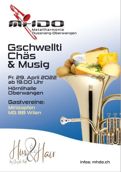 Nach zwei Jahren Zwangspause dürfen wir wieder unser traditionelles «Gschwellti, Chäs und Musig» in der Hörnlihalle durchführen. Wir freuen uns, die MG BB Wilen als Gastverein begrüssen zu dürfen.